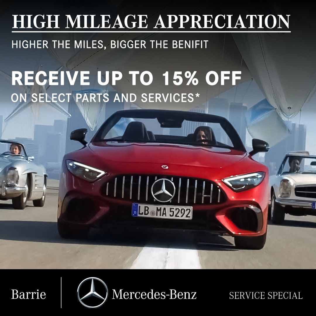 *Offer valid for Mercedes-Benz vehicles only. Discount based on odometer reading at time of service: 10 percent off for 100,000–149,999 km; 15 percent off for 150,000 km or more. Discount applies to qualifying repairs and services before tax. Excludes Service A and Service B maintenance packages. Plus tax and shop supplies, if applicable. Not valid on tires, body work, insurance work, or with other offers or discounts. Offer subject to change without notice and may be withdrawn at any time. Applicable to most vehicle makes and models; some exclusions may apply. Offer has no cash value and is non-transferable. One coupon per vehicle, per visit. Offer ends Feb 28th. See dealer for details.