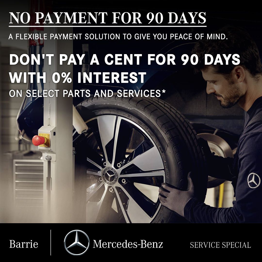 *Offer valid on approved credit through participating financial institutions for qualifying service and parts purchases at authorized Mercedes-Benz dealers. 0 percent interest applies only if the total financed amount is paid in full within the 90-day promotional period. No payments are required for the first 90 days from the date of service. If the balance is not paid in full by the end of the promotional period, interest may be charged from the original purchase date at the standard annual percentage rate (APR) as per the cardholder or financing agreement. Minimum purchase amount may apply. Subject to credit approval. Offer cannot be applied to previous purchases. Not valid on insurance deductibles, or cash transactions. Offer subject to change without notice and may be withdrawn at any time. Applicable to most vehicle makes and models; some exclusions may apply. Offer ends Feb 28th. See dealer for details.
