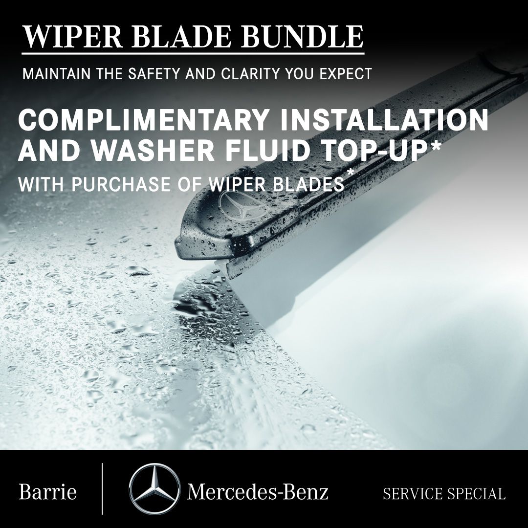 *Offer valid with the purchase of a set of Genuine Mercedes-Benz front Wiper Blades. Includes complimentary installation and a washer fluid top-up. Parts are sold at regular price. Plus tax and shop supplies, if applicable. Offer subject to change without notice and may be withdrawn at any time. Applicable to most vehicle makes and models; some exclusions may apply. Offer ends Feb 28th. See dealer for details.